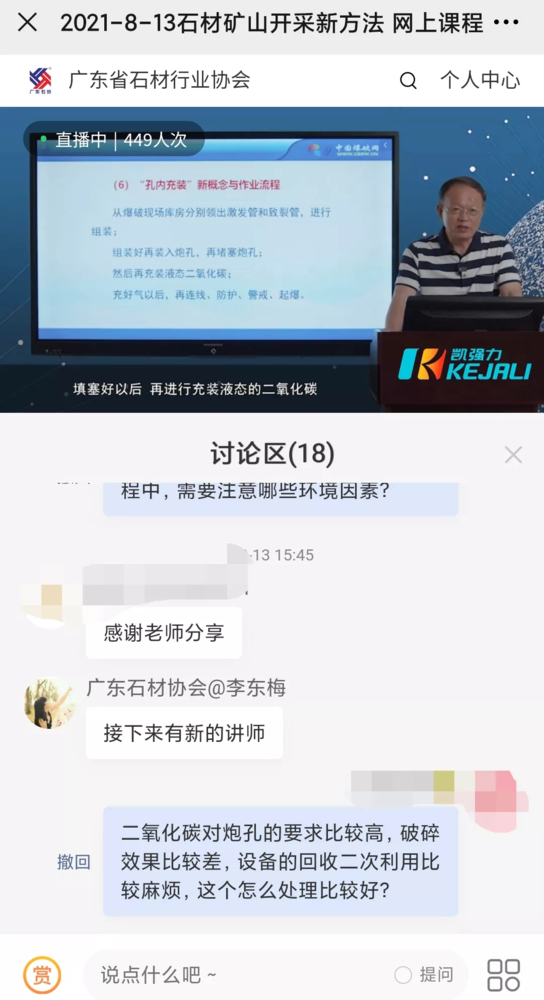 本期网课堂主打两大主题,分别是:地勘中心矿产资源、勘探资讯分享以及新一代二氧化碳爆破技术介绍、技术答疑,邀请了中国建材地勘中心广东总队陈永桂以及力凯工程装备(深圳)有限公司总经理方莹、技术顾问朱振海,先后分别作主题授课。老师结合案例和理论知识在各自擅长的领域为各位领导和嘉宾带来生动形象的课程,课上并与学员进行技术答疑,课后在微信交流群进一步详谈解答,双管齐下,授课方式深受行业的学者认可。